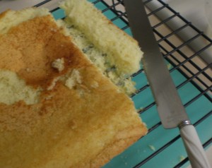 The cake- recipes call for lady fingers, which are sponge cake-type cookies. I couldn’t find lady fingers at King Soopers, so I though maybe angel food cake, which they have had regularly all summer- no, not anymore. So, I made a sponge cake using a recipe from Better Homes and Gardens cook book, which is my go-to cookbook for basic stuff. I let it cool on a rack, then sliced it into chunks. Since it is going into jars, it doesn’t matter if it’s pretty.