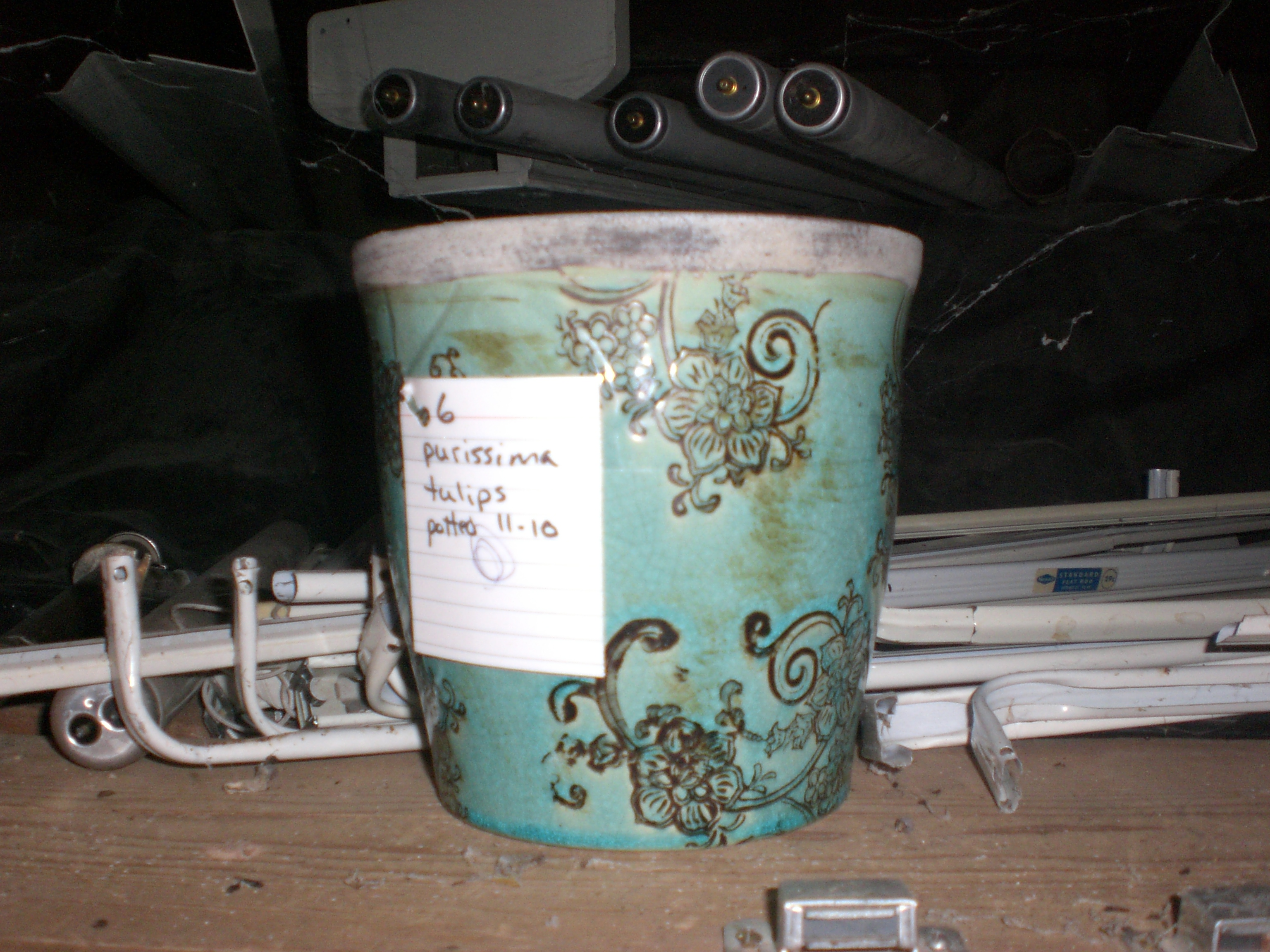 Then I had a brainstorm: in our basement, there is a little door to an undercrawl- the main part of the basement is finished and heated and civilized, but the undercrawl is open to Mother Earth herself. I was considering where to put my pot of tulips, when I thought of that little door. So, the pot is there, to wait out the rest of fall, and a chunk of winter, and then in the dark days of January, after the tree is down, the dangly sparkly things put away, the twinkly lights rolled up and boxed, I will have a little pot of spring waiting for me in the basement.