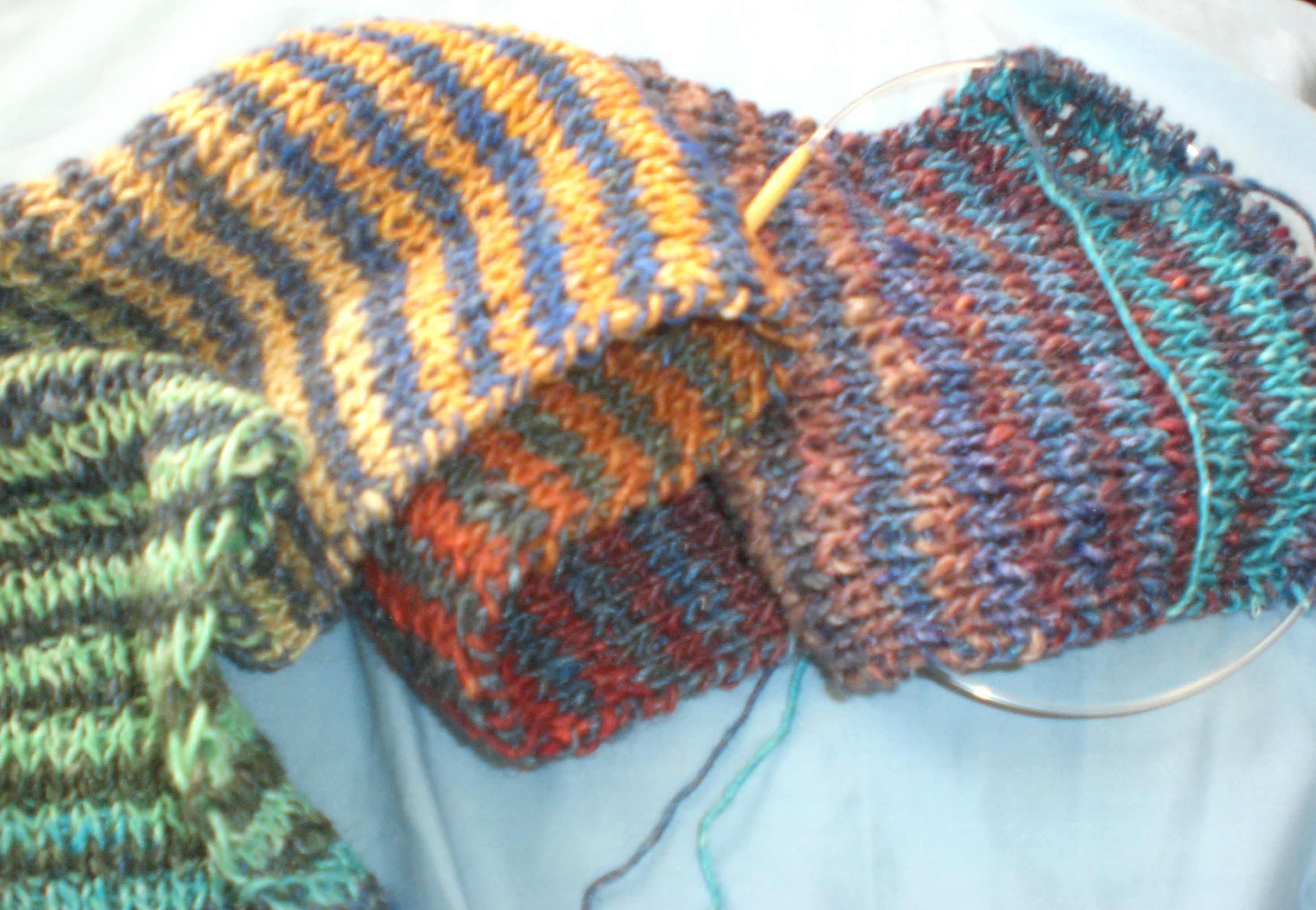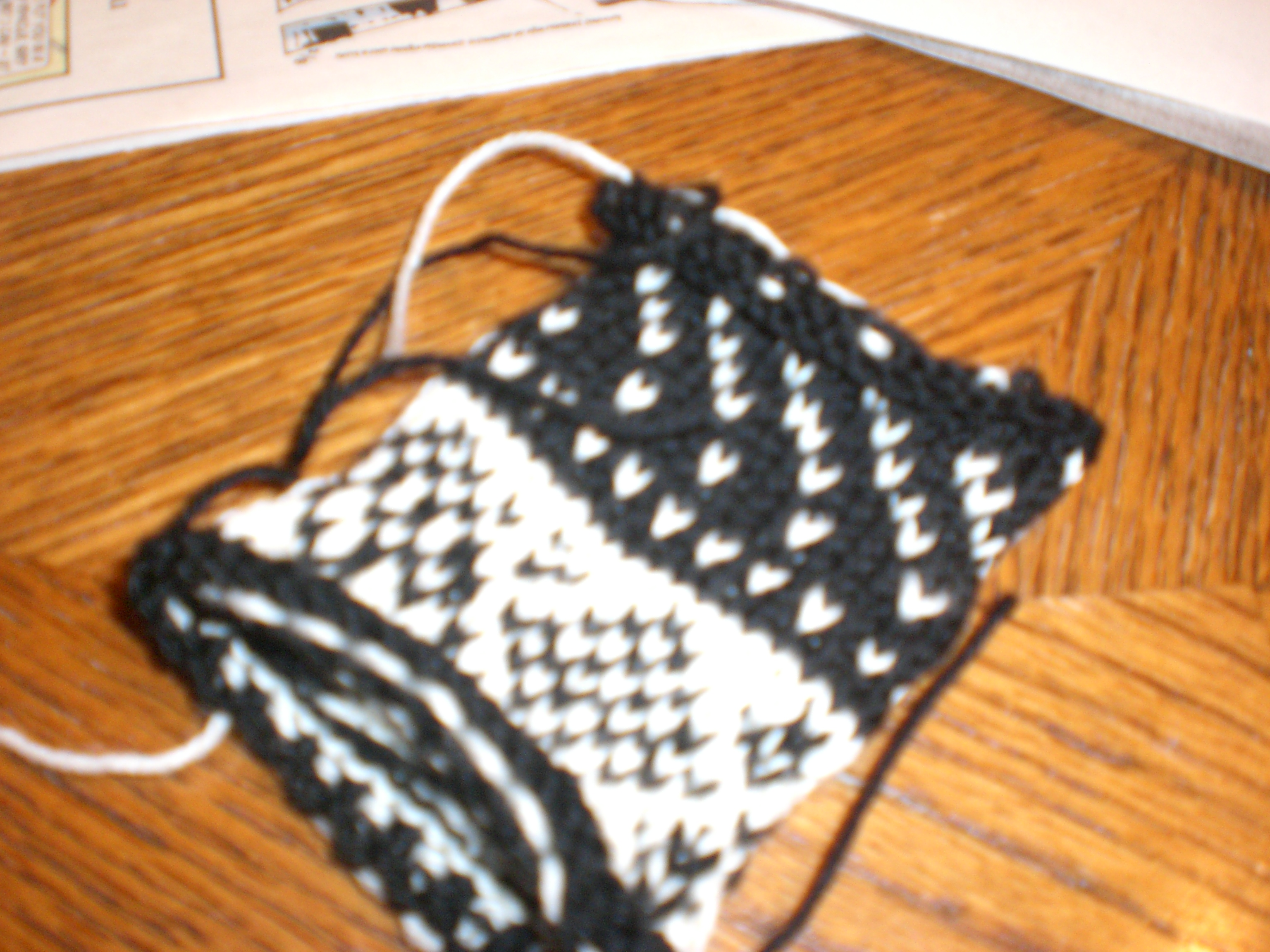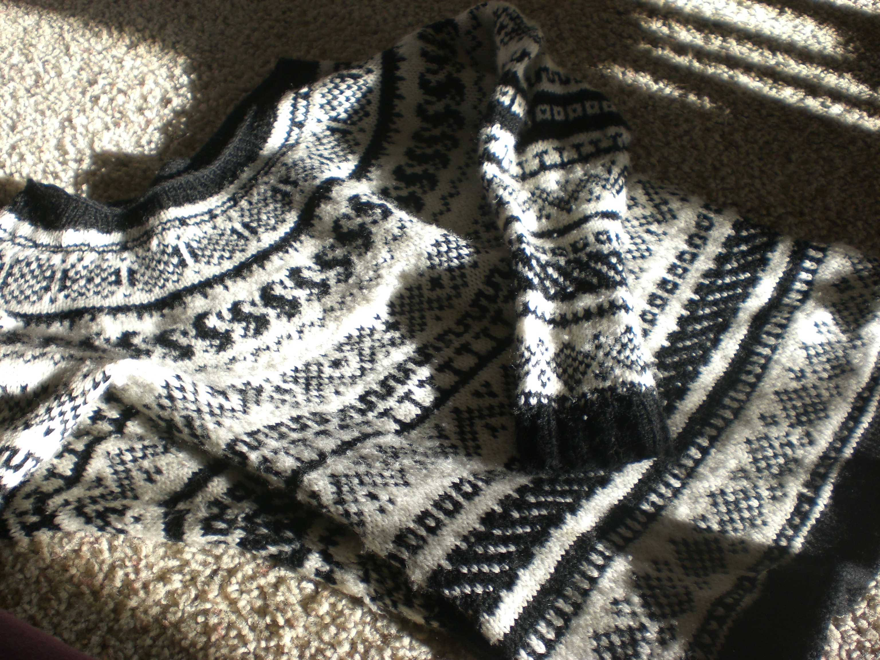 I cast on about 200 stitches in sock yarn for the body, and started on the patterns going up the body to the armpits. It was kind of fascinating- you hold the black yarn in one hand, the white in the other, and go across the rows, knitting four of black, 3 of white, or whatever, and row by row the pattern builds. Checkerboards, snowflakes, giant backward letter “s” . With the amount of work this was going to be, I wanted it to fit for a few years, so I made it extra long, and by the time I got to the armpits, it was time to start the sleeves. This was where I got stalled.