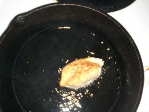 Fry: I use my smallest cast iron skillet, about 6 inch diameter, and heat about 1/2 inch of canola oil til it shimmered. I was going to check the temperature with my thermometer, but then the boy got upset with me because I told him he spelled Jurassic wrong, and all hell broke loose. Fry a couple at a time until they are goldn brown and delicious, place on a paper towel to cool. DH thought any dunking sauce was gilding the lily, bless his heart, but I used a little orange sauce (from a bottle- I’m not perfect)