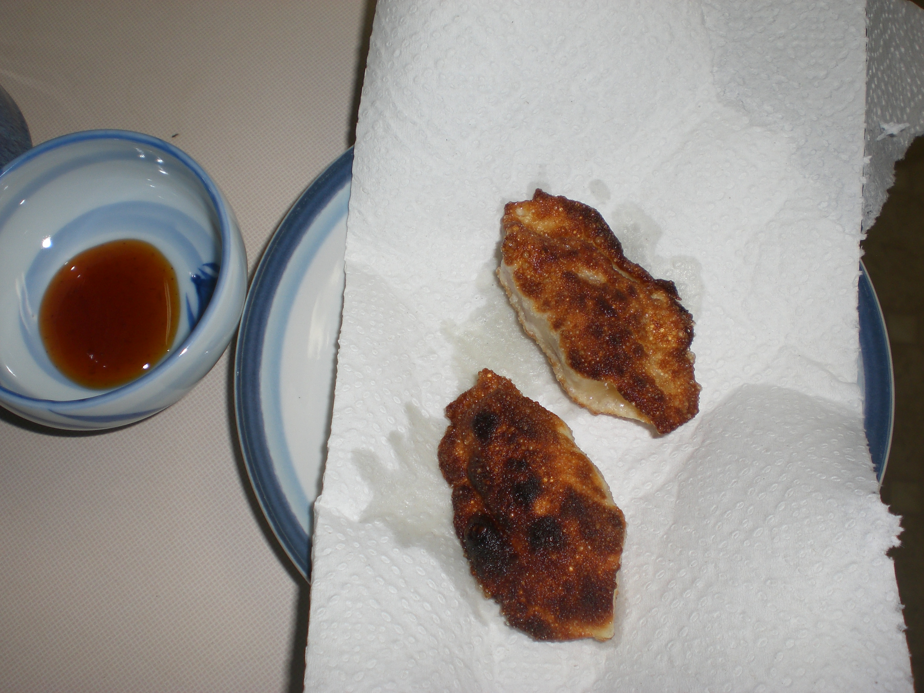 I made mine last night with fake crab- krab with a k. My frugality bit me here- crab, or krab, is so mild flavored that I didn’t want to spend big bucks on something that would pretty much taste like ginger and onion. Looking back, though, I only used part of the package, maybe 4 ounces, so it wouldn’t have broken me to use real crustacean. If I lived closer to the ocean, I probably would. When Mei taught me to make these, we steamed them to ensure the pork cooked all the way through. Since the krab is already cooked, this is less of a worry. I steamed about 9 dumplings while the rice for the rest of our dinner was cooking, and fried the rest.