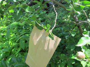 Most websites I found suggested sprays and traps and pheromones, which I don’t really want to mess with. Expensive and time consuming. Then I came across this guy (http://www.finegardening.com/pages/g00062.asp)at Fine Gardening magazine, and got a paradigm shift- instead of trying to kill all the bugs, why not just prevent the bugs from getting to the apples?