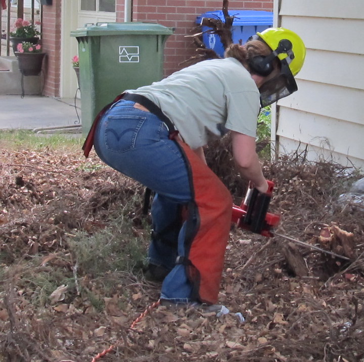 I’m glad we rented, because safety equipment came with it. If we had bought a saw, I know we would have half-assed the safety part. Sure, I would have worn safety goggles, but the kit from the rental place had chaps, and goggles, and a hard hat with hearing protection.