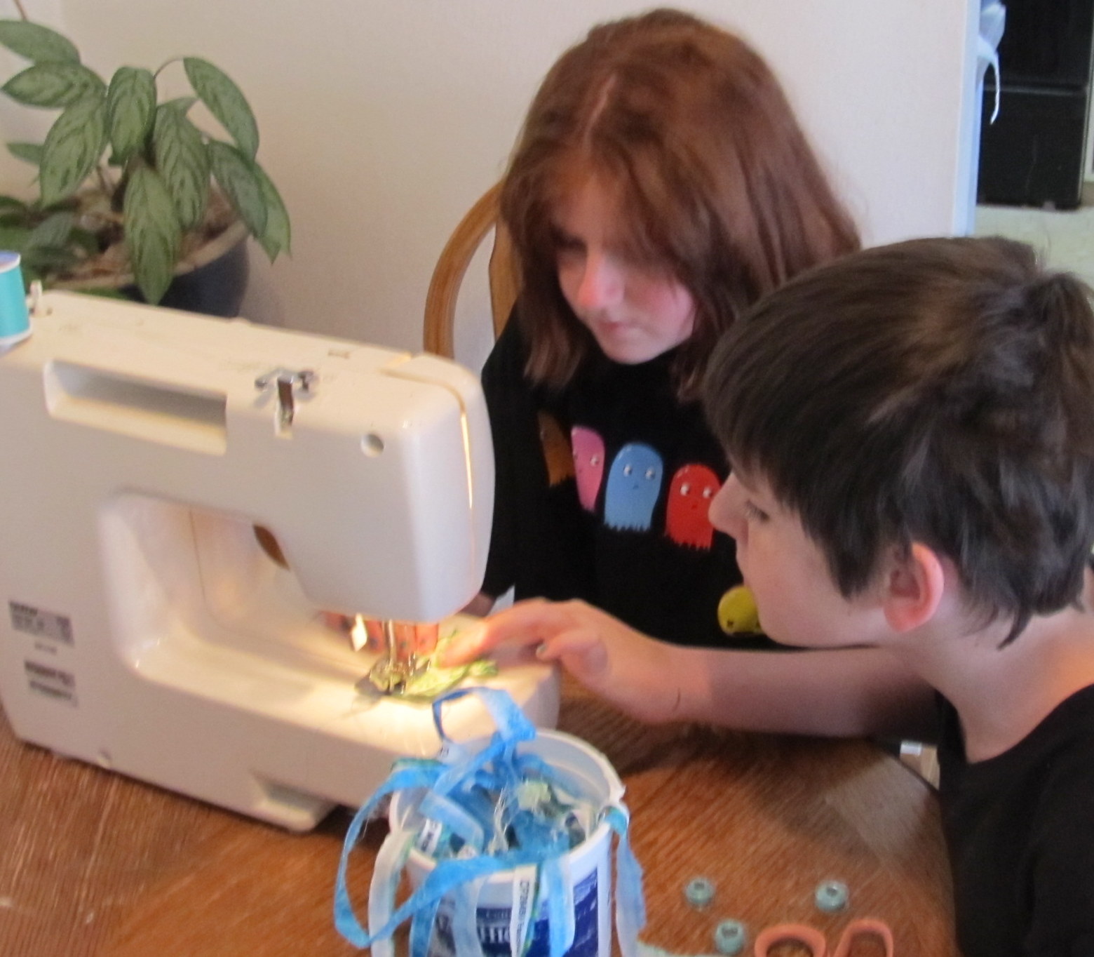 I mused to myself how I would be able to control my “control-freakiness” with Kate, and let her sew without hovering over her.  It turns out, I am not having to, very much. I helped her wind bobbins, pinned some seams on pillowcases, let her sew…and then she kind of got bored. We had 6 long panels, 84 inches by 22 inches, so we sewed them together, then sewed across the top.  Kate drifted off leaving me to zigzag the six long seams and press a hem  in the opening.IMG_0033