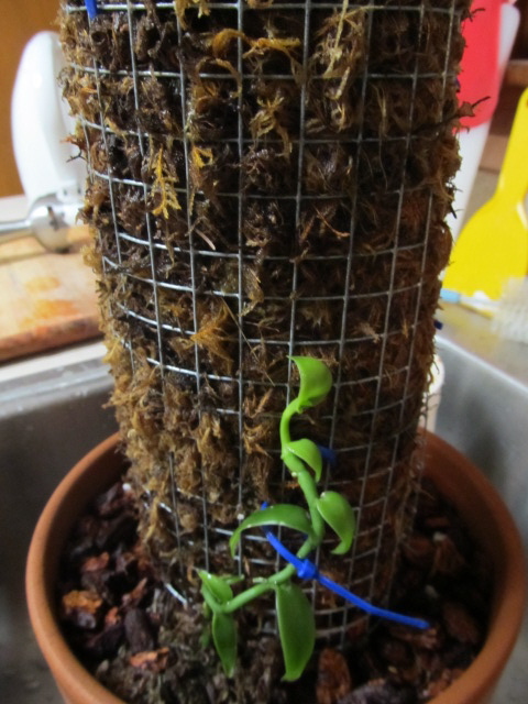 I never believed I could grow a vanilla orchid without a greenhouse- credit the Botanic Garden (again- I’m a little obsessed with the place). At the very end of my visit there with my wonderful MIL, we went to the learning center at the children’s section. This place isn’t quite a greenhouse, but it has large south windows. There was a display of herbs and spices, and an employee was working on a plant in a container- wrapping a long vine around a tower made of chicken wire with sheet moss inside. I asked what it was, and actually said “Squee” when he told me it was vanilla.