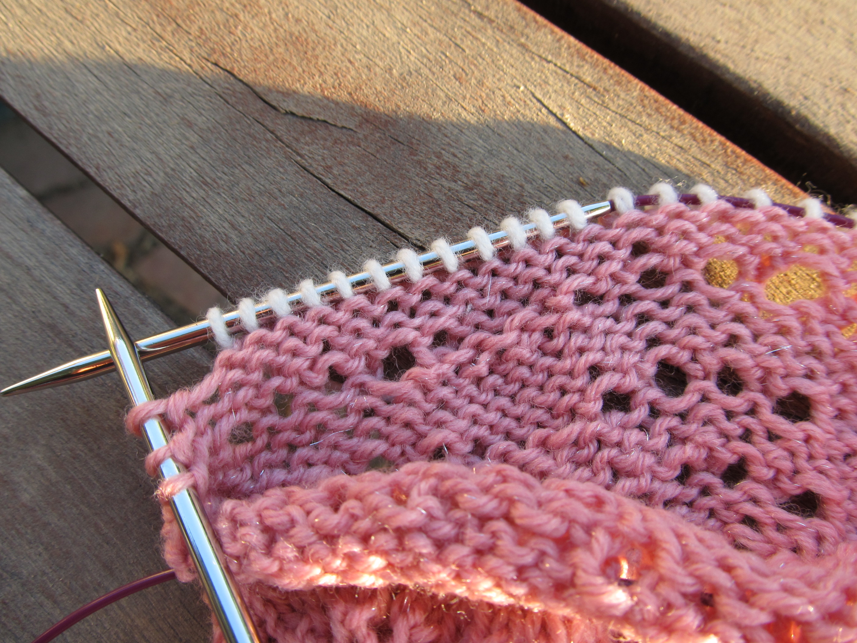 Cast on 99 stitches in pink and work old shale pattern as written for 3 repeats. (Making the third row perl makes it so the edge does not roll.) Then continue without perling the 3rd row until the piece measures 3 inches from cast on edge- which will be scalloped. Or, if you have a tiny amount of contrast yarn, go until you run out of yarn, as I did.