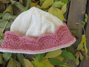 Anyway, I had a golf-ball sized chunk of it left, and a great-niece on the way, and I thought, what better use for this perfect little… shoot, not enough. I wasn’t in complete denial, as I went along I considered ways of making it work. Maybe making it deliberately little- just a beanie? Nah. Maybe a rapid flat-topped decrease on top, like a pillbox. Nah. Then I thought about it backwards and inside out- what if we considered the pink lacy part to be a cuff, to folded up over a white background? that way the lace would be more defined, and there would be some adjustability in the ear coverage.