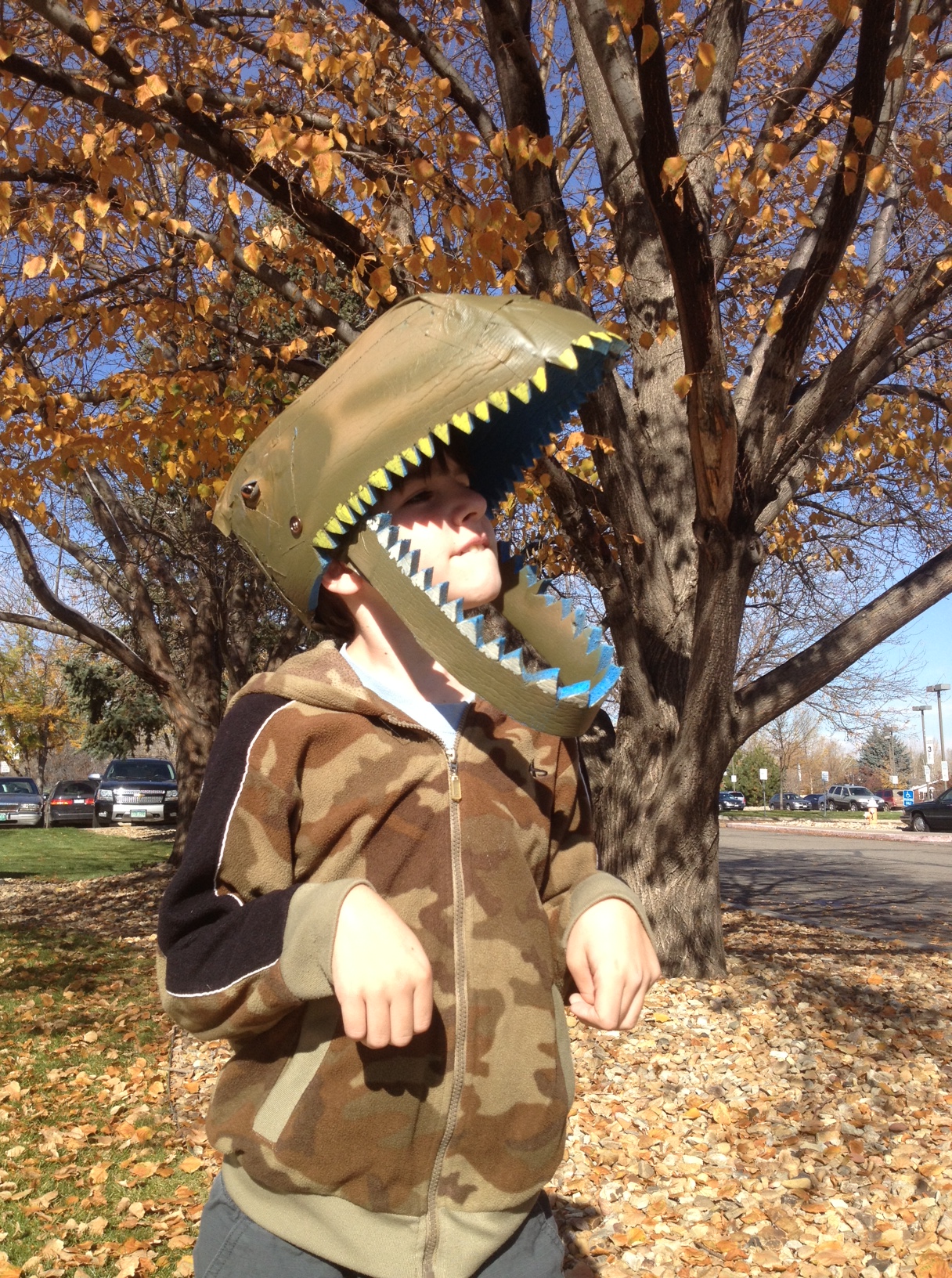 His thought was originally a wire framed puppet mask/hat thing, and he sketched and planned, and kept asking me to go wire shopping. He wanted the jaw to contain his candy bag, so people would be throwing candy into the dinosaur’s mouth.