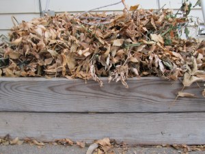 A mix of autumn leaves and dead tomato plants, with some sticks on top so it won’t blow away. By spring, it will all boil down to the level of the top of the raised bed.